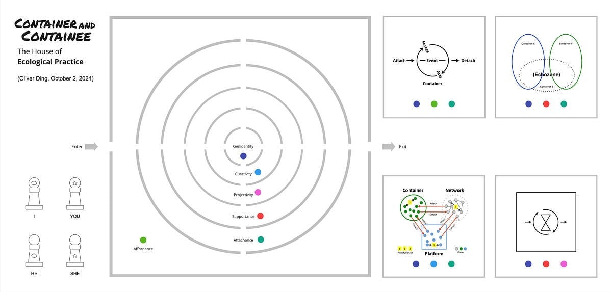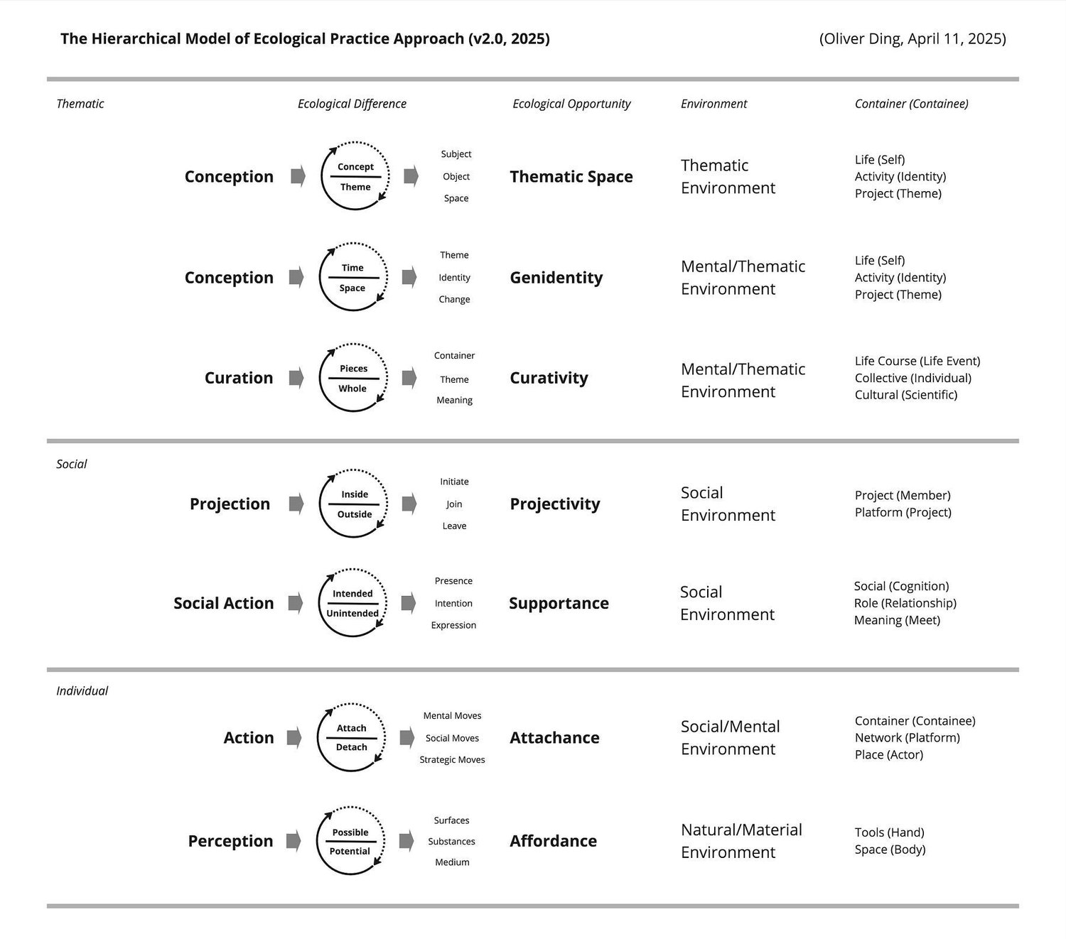Container Thinking introduces the Ecological Practice Approach (v4.0), which draws inspiration from figures such as Gibson, Lakoff, and Schön. It is built around core concepts, including Container, Containee, and a range of ecological opportunities - Affordance, Supportance, and Curativity.