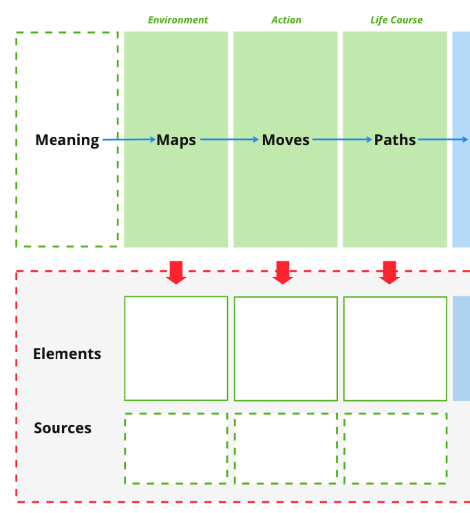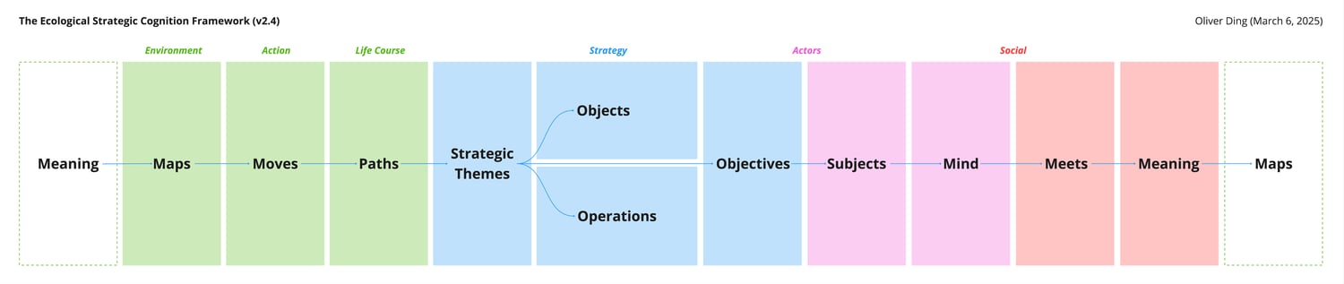 The Ecological Strategic Cognition (v2.4) framework offers 11 thematic spaces. By reflecting on each thematic space, one by one, you can generate your own strategic frameworks.